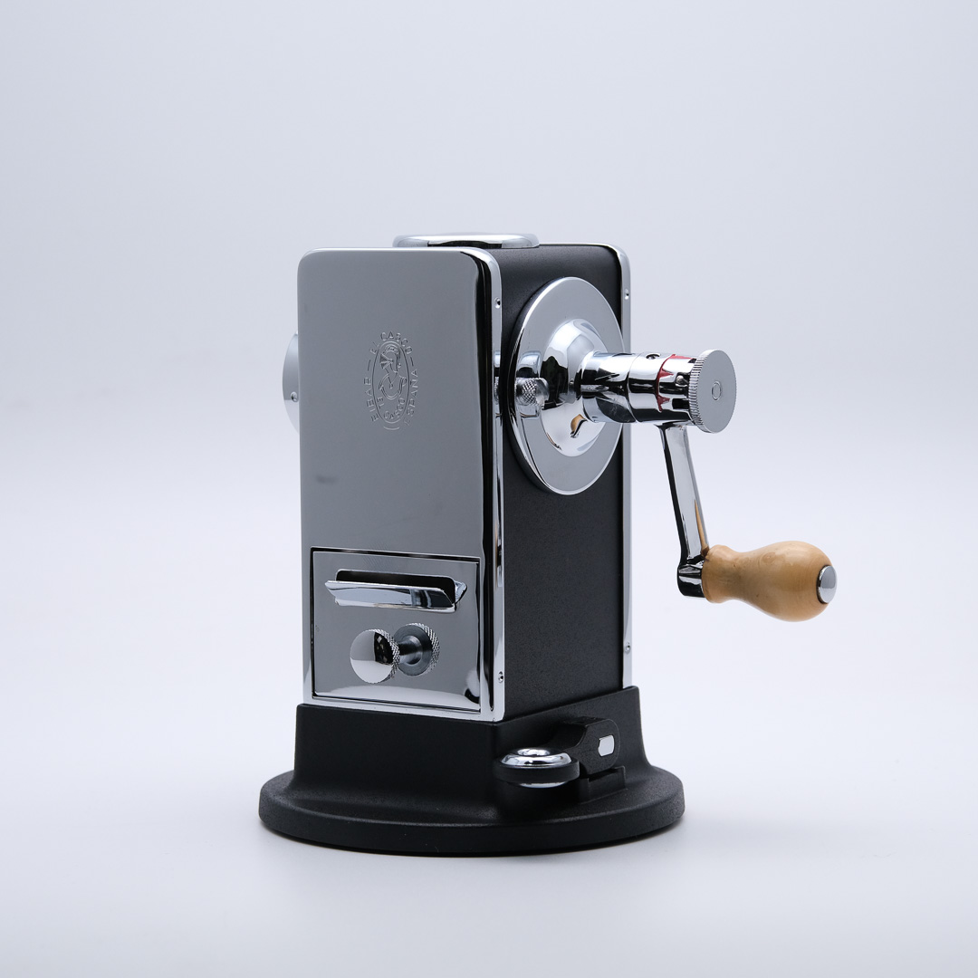 Temperamatite a manovella con finitura nera e cromata lucida.