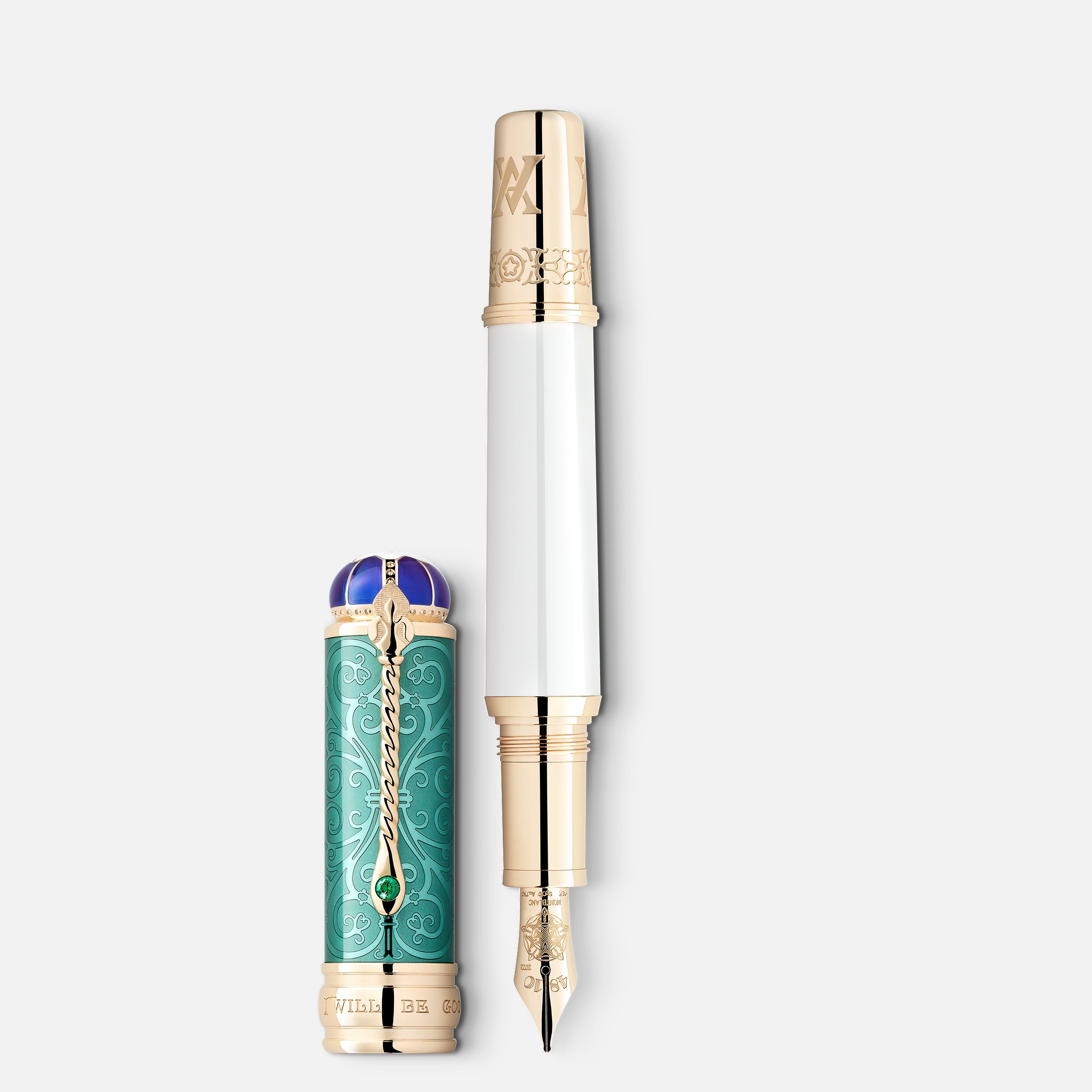 Nel 2022, la Montblanc Patron of Art Edition è dedicata alla Regina Vittoria e al Principe Alberto. La Limited Edition 4810 è una splendida edizione doppia: una rende omaggio alla Regina Vittoria, l’altra al Principe Consorte Alberto. La Montblanc Patron of Art Homage to Victoria Limited Edition 4810 celebra la giovane Vittoria e presenta un corpo in lacca di colore bianco perlato e un cappuccio in lacca verde menta traslucida con un motivo vittoriano al di sotto. Le finiture sono in oro esclusivo. La forma della clip è un tributo al suo scettro, mentre la gemma sintetica color verde scuro rende omaggio al suo anello di fidanzamento. La parte superiore del cappuccio è ispirata alla corona reale ed è ornata dall’emblema Montblanc in pregiata resina bianca. L’anello del cappuccio reca incisa la dicitura “I will be good”, mentre il cono è decorato da una speciale incisione. In omaggio al soprannome di Vittoria – “England’s rose” (Rosa d’Inghilterra) – il pennino in oro massiccio Au 750 lavorato a mano reca la goffratura di una rosa. Con oro esclusivo e/o rivestimento in oro esclusivo, Montblanc descrive la tonalità luminosa di oro giallo che è diventata un simbolo degli strumenti da scrittura della Maison.